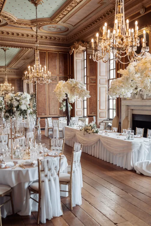 Indoors, discover grand reception rooms with ornate architectural details, lit by tall windows and sparkling chandeliers.