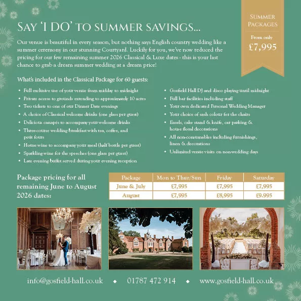 Whatever the weather, our selection of spaces ensures the ceremony and celebrations always go ahead. Gosfield Hall really is a venue for all seasons.