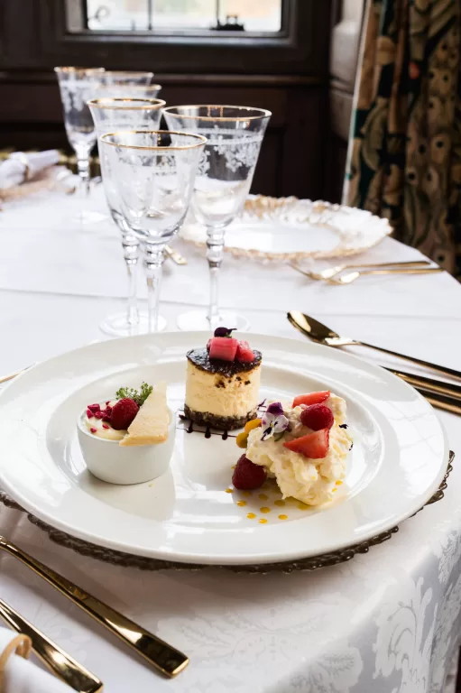 The wood-panelled Dining Room seats 80 guests beneath shimmering chandeliers. Tall windows and a grand fireplace add elegant details.
