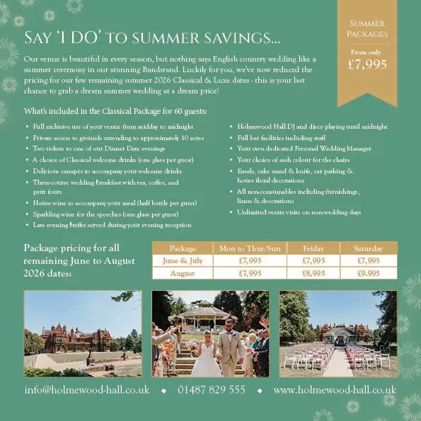 Whatever the weather, our selection of spaces ensures the ceremony and celebrations always go ahead. Holmewood Hall really is a venue for all seasons.